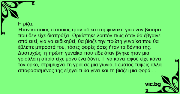 Ήταν κάποιος ο οποίος ήταν άδικα στη φυλακή για έναν βιασμό που δεν είχε διαπράξει. Ορκίστηκε λοιπόν πως όταν θα έβγαινε από εκεί, για να εκδικηθεί, θα βίαζε την πρώτη γυναίκα που θα έβλεπε μπροστά του, τόσες φορές όσες ήταν τα δόντια της.