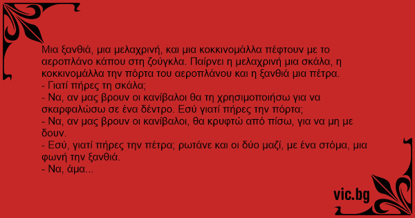 Μια ξανθιά, μια μελαχρινή, και μια κοκκινομάλλα πέφτουν με το αεροπλάνο κάπου στη ζούγκλα. Παίρνει η μελαχρινή μια σκάλα, η κοκκινομάλλα την πόρτα του αεροπλάνου και η ξανθιά μια πέτρα.