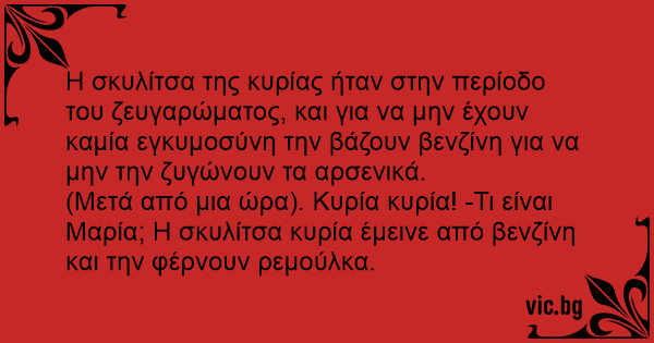 (Μετά από μια ώρα). Κυρία κυρία! -Τι είναι Μαρία; Η σκυλίτσα κυρία έμεινε από βενζίνη και την φέρνουν ρεμούλκα.