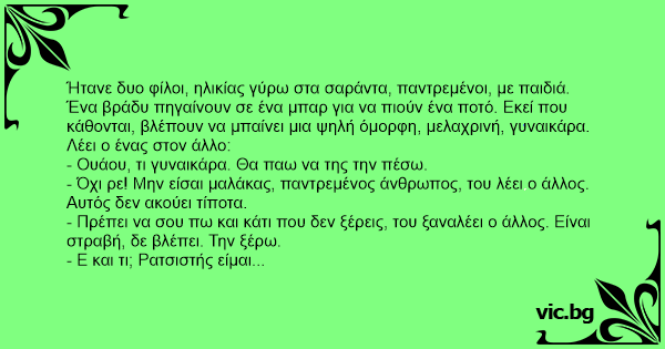 - Ε και τι; Ρατσιστής είμαι εγώ; απαντάει ο άλλος και πλησιάζει την κοπέλα.