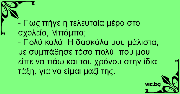 - Πολύ καλά. Η δασκάλα μου μάλιστα, με συμπάθησε τόσο πολύ, που μου είπε να πάω και του χρόνου στην ίδια τάξη, για να είμαι μαζί της.