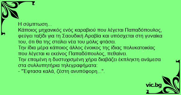 Κάποιος μηχανικός ενός καραβιού που λέγεται Παπαδόπουλος, φεύγει ταξίδι για τη Σαουδική Αραβία και υπόσχεται στη γυναίκα του, ότι θα της στείλει νέα του μόλις φτάσει.
