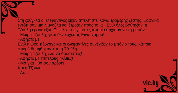 Στη ζούγκλα οι ελεφαντίνες είχαν απελπιστεί λόγω τρομερής ζέστης. Ξαφνικά εντόπισαν μια λιμνούλα και έτρεξαν προς τα κει. Ενώ όλες βούτηξαν, η Τζούλη έμεινε έξω. Οι φίλες της γεμάτες απορία άρχισαν να τη ρωτάνε: