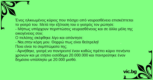Ένας ηλικιωμένος κύριος που πάσχει από νευρασθένεια επισκέπτεται το γιατρό του. Μετά την εξέταση του ο γιατρός τον ρώτησε: