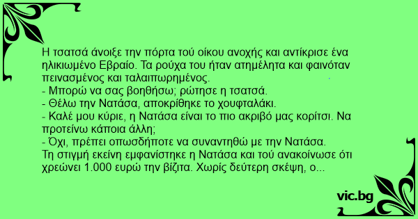 Τη στιγμή εκείνη εμφανίστηκε η Νατάσα και τού ανακοίνωσε ότι χρεώνει 1.000 ευρώ την βίζιτα. Χωρίς δεύτερη σκέψη, ο γέρος έβγαλε από την τσέπη του δέκα κολλαριστά χαρτονομίσματα των 100 ευρώ. Πήγαν λοιπόν στο δωμάτιο για μια ώρα, και στη συνέχεια ο μπάρμπας αποχώρησε ήρεμα.