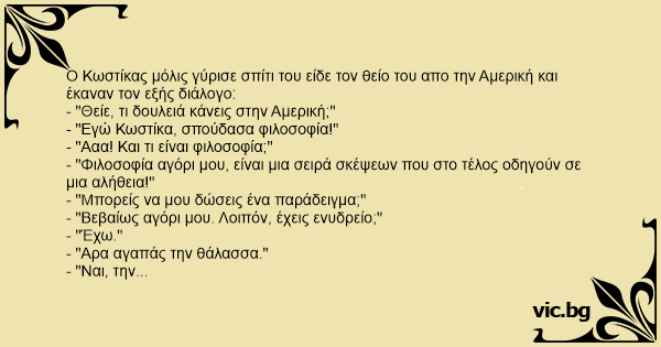 Ο Κωστίκας μόλις γύρισε σπίτι του είδε τον θείο του απο την Αμερική και έκαναν τον εξής διάλογο: