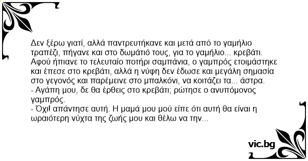 Δεν ξέρω γιατί, αλλά παντρευτήκανε και μετά από το γαμήλιο τραπέζι, πήγανε και στο δωμάτιό τους, για το γαμήλιο... κρεβάτι. Αφού ήπιανε το τελευταίο ποτήρι σαμπάνια, ο γαμπρός ετοιμάστηκε και έπεσε στο κρεβάτι, αλλά η νύφη δεν έδωσε και μεγάλη σημασία στο γεγονός και παρέμεινε στο μπαλκόνι, να κοιτάζει τα... άστρα.