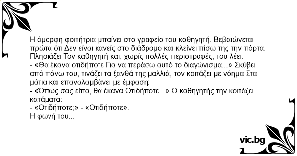 - «Θα έκανα οτιδήποτε Για να περάσω αυτό το διαγώνισμα...» Σκύβει από πάνω του, τινάζει τα ξανθά της μαλλιά, τον κοιτάζει με νόημα Στα μάτια και επαναλαμβάνει με έμφαση: