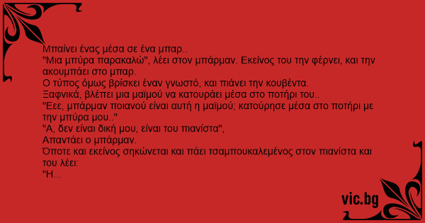 "Μια μπύρα παρακαλώ", λέει στον μπάρμαν. Εκείνος του την φέρνει, και την ακουμπάει στο μπαρ.