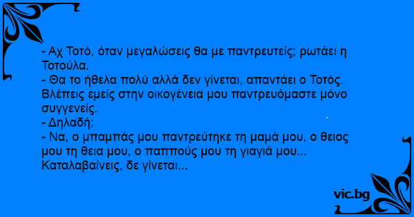 - Θα το ήθελα πολύ αλλά δεν γίνεται, απαντάει ο Τοτός. Βλέπεις εμείς στην οικογένεια μου παντρευόμαστε μόνο συγγενείς.