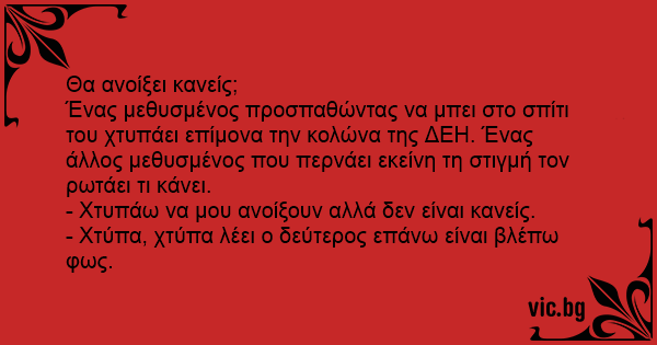 Ένας μεθυσμένος προσπαθώντας να μπει στο σπίτι του χτυπάει επίμονα την κολώνα της ΔΕΗ. Ένας άλλος μεθυσμένος που περνάει εκείνη τη στιγμή τον ρωτάει τι κάνει.