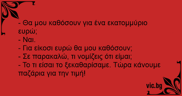 - Το τι είσαι το ξεκαθαρίσαμε. Τώρα κάνουμε παζάρια για την τιμή!