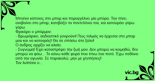 Μπαίνει κάποιος στο μπαρ και παραγγέλνει μία μπύρα. Την πίνει, ανεβαίνει στο μπαρ, κατεβάζει τα παντελόνια του, και κατουράει γύρω γύρω.