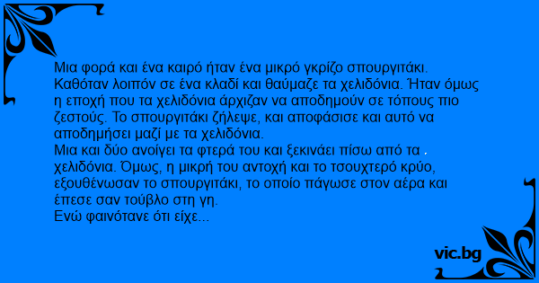 Μια και δύο ανοίγει τα φτερά του και ξεκινάει πίσω από τα χελιδόνια. Όμως, η μικρή του αντοχή και το τσουχτερό κρύο, εξουθένωσαν το σπουργιτάκι, το οποίο πάγωσε στον αέρα και έπεσε σαν τούβλο στη γη.