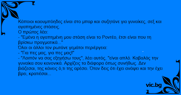 - "Λοιπόν να σας εξηγήσω τους", λέει αυτός, "είναι απλό. Καβαλάς την γυναίκα σου κανονικά. Αρχίζεις τα διάφορα όπως συνήθως. Δεν βιάζεσαι, της κάνεις ό,τι της αρέσει. Όταν δεις ότι έχει ανάψει και την έχει βρει, κρατιέσαι γερά. Σκύβεις και τις ψιθυρίζεις στο αυτί: Και η αδερφή σου λατρεύει αυτήν την στάση! Μετά προσπαθείς να κρατηθείς πάνω της!"
