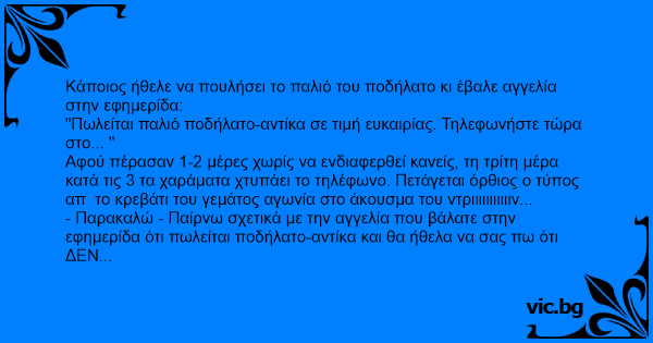 "Πωλείται παλιό ποδήλατο-αντίκα σε τιμή ευκαιρίας. Τηλεφωνήστε τώρα στο... "