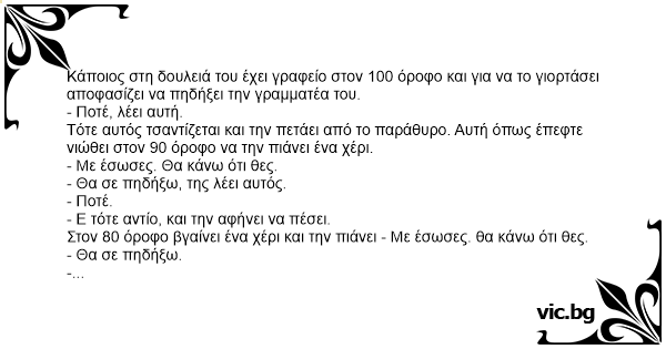 Κάποιος στη δουλειά του έχει γραφείο στον 100 όροφο και για να το γιορτάσει αποφασίζει να πηδήξει την γραμματέα του.