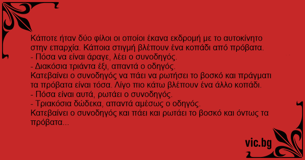 Κάποτε ήταν δύο φίλοι οι οποίοι έκανα εκδρομή με το αυτοκίνητο στην επαρχία. Κάποια στιγμή βλέπουν ένα κοπάδι από πρόβατα.