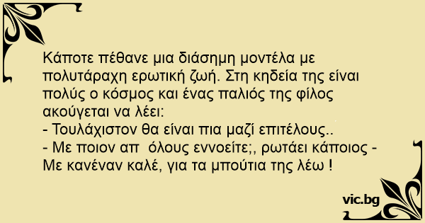 - Με ποιον απ όλους εννοείτε;, ρωτάει κάποιος - Με κανέναν καλέ, για τα μπούτια της λέω !