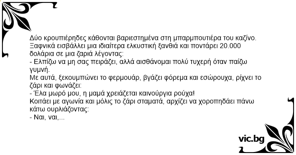 Плавуша во казино Влиза красива блондинка в казино, слага 20000 евро на едно число и казва на мъжете около масата: Казино... Ранно утро. Засукана мацка приближава към рулетката: Two croupiers are sitting bored at the roulette of THE CASINO. Eine Blondine geht ins Spielkasino. Dort angekommen verkündet sie, dass sie ihr ganzes Geld auf eine Zahl setzen wird. Zu den zwei verantwortlichen Angestellten sagt sie, während die Kugel ins Spiel kommt: "Ich glaube nicht, dass es euch interessiert, aber ich habe mehr Glück, wenn ich... Згодна надарена плавуша влегува во казино, вади 10.000 евра и им вели на мажите околу масата: - Се надевам дека нема да ви смета ако се соблечам гола, така имам повеќе среќа. Мажите се согласиле, таа се соблекла, ги фрлила коцките и вели: - Ајде коцкички, ајде, ми требаат нови алишта. Коцките... Two bored casino dealers were waiting at the craps tables for players when a gorgeous blonde lady walked in and asked if they minded if she bet twenty thousand dollars on a single roll of the dice.... Iki gazino krupyesi canlari sikkin, rulet masasi basinda musteri bekliyorlardi. Bu sirada cazibeli bir sarisin elinde USD 20.000 lik fisle masaya dogru yaklasti ve - "Pardon oynayabilir miyiz?"... Muito bonita e gostosa, a loira entra pela porta do cassino. Vai ao caixa, troca cinco mil dólares por fichas e segue para mesa da roleta. Para espanto de todos que estavam jogando, ela avisa que... An attractive Irish blonde  at a Casino seemed a little Intoxicated She bet 10,000 Euro on a single Roll of dice  and said: “I hope u don’t mind, but I feel Luckier when I am in my birthday... Een knappe blonde vrouw, met alles erop en eraan, wandelt een casino binnen en loopt recht naar de tafel waar gedobbeld wordt. Ze legt € 10.000 op tafel en zet alles meteen in op de 8. De twee... Une séduisante blonde arrive dans un casino à Las Vegas. Un petit peu éméchée, elle mise 20 000 dollars sur une face du dé. Elle ajoute en suivant : « J’espère que cela ne vous dérange pas, mais je... Eine atemberaubende Blondine betritt das Casino. Sie kauft sich Jetons und geht zum Roulette-Tisch. Dort angekommen fragt sie die Croupiers: „Darf ich mich ausziehen? Wenn ich nackt spiele, gewinne... Dwaj znudzeni krupierzy siedzieli przy stole z ruletką gdy do kasyna weszła bardzo atrakcyjna blondynka. Podeszła do stołu i zadeklarowała zakład na 20 tys. dolarów na konkretną liczbę. Zaraz... Twee verveelde casino dealers zitten te wachten aan de dobbel tafel. Op dat moment komt er een prachtige blonde vrouw aan lopen en zet twintig duizend euro in op een enkele rol. Ze zegt: "Ik hoop... Twee croupiers in het casino kijken verveeld voor zich uit. Plotseling komt er een hele mooie vrouw aan, die haar geluk wil beproeven met de dobbelstenen. Ze wil 20.000 euro inzetten, met een... GAZİNODA iki görevli sıkıntıdan patlamış bir şekilde rulet masasında Dikiliyorlarmış… Derken içeri fıstık gibi bir sarışın girmiş, masaya 10 bin dolar koymuş Veee; ? "Baylar, umarım sizin için... Det var på ett kasino, mitt i natten. Kvar vid ett spelbord satt två män och en kvinna. En välsvarvad snygg blondin. - Jag känner på mig att jag har tur ikväll, sa kvinnan, jag satsar 500 000... Se duce o blonda la cazino si zice: - Vreau sa pariez pe 2 numere, dar ca sa castig trebuie sa ma dezbrac. Toti sunt de acord, se dezbraca si arunca zarurile. - Am castigat, am castigat,incepe sa... Een knap blondje loopt een casino binnen in Vegas. Ze gaat naar een van de roulettetafels en zegt tegen de twee mannen die er staan: "Ik zou graag alles of niets spelen. 20.000 $ voor één worp." De...
