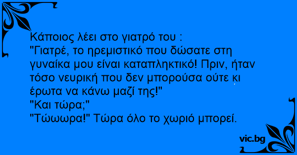 "Γιατρέ, το ηρεμιστικό που δώσατε στη γυναίκα μου είναι καταπληκτικό! Πριν, ήταν τόσο νευρική που δεν μπορούσα ούτε κι έρωτα να κάνω μαζί της!"