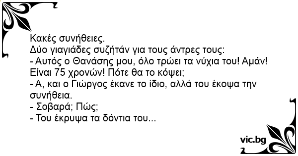 - Αυτός ο Θανάσης μου, όλο τρώει τα νύχια του! Αμάν! Είναι 75 χρονών! Πότε θα το κόψει;