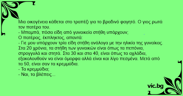 - Γιε μου υπάρχουν τρία είδη στήθη ανάλογα με την ηλικία της γυναίκας. Στα 20 χρόνια, τα στήθη των γυναικών είναι όπως τα πεπόνια, στρογγυλά και στητά. Στα 30 και στα 40, είναι όπως τα αχλάδια, εξακολουθούν να είναι όμορφα αλλά είναι και λίγο πεσμένα. Μετά από τα 50, είναι σαν τα κρεμμύδια.
