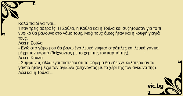 Ήταν τρεις αδερφές. Η Σούλα, η Κούλα και η Τούλα και συζητούσαν για το τι νυφικό θα βάλουνε στο γάμο τους. Μαζί τους όμως ήταν και η κουφή γιαγιά τους.