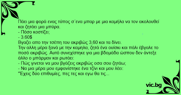 Πάει μια φορά ενας τύπος σ΄ενα μπαρ με μια καμήλα να τον ακολουθεί και ζητάει μια μπύρα.