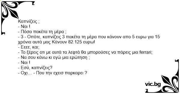 - 3 - Οπότε, καπνίζεις 3 πακέτα τη μέρα που κάνουν απο 5 ευρω για 15 χρόνια αυτά μας Κάνουν 82.125 ευρω!