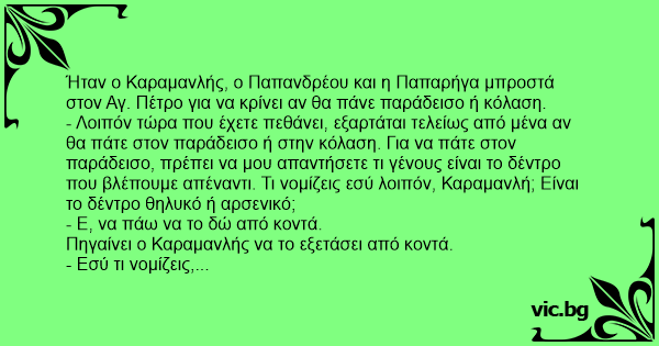 - Λοιπόν τώρα που έχετε πεθάνει, εξαρτάται τελείως από μένα αν θα πάτε στον παράδεισο ή στην κόλαση. Για να πάτε στον παράδεισο, πρέπει να μου απαντήσετε τι γένους είναι το δέντρο που βλέπουμε απέναντι. Τι νομίζεις εσύ λοιπόν, Καραμανλή; Είναι το δέντρο θηλυκό ή αρσενικό;