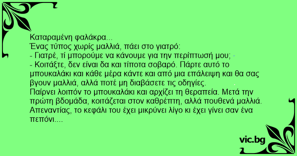 - Κοιτάξτε, δεν είναι δα και τίποτα σοβαρό. Πάρτε αυτό το μπουκαλάκι και κάθε μέρα κάντε και από μια επάλειψη και θα σας βγουν μαλλιά, αλλά ποτέ μη διαβάσετε τις οδηγίες.