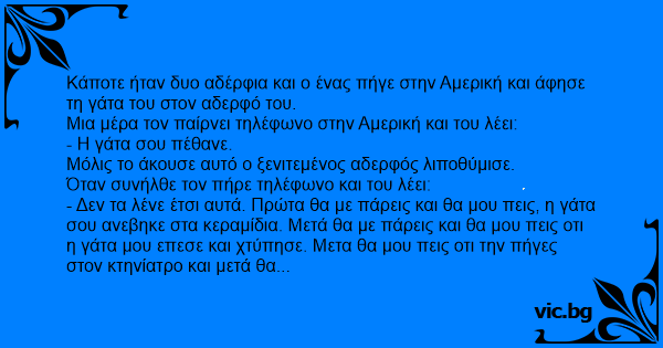 - Δεν τα λένε έτσι αυτά. Πρώτα θα με πάρεις και θα μου πεις, η γάτα σου ανεβηκε στα κεραμίδια. Μετά θα με πάρεις και θα μου πεις οτι η γάτα μου επεσε και χτύπησε. Μετα θα μου πεις οτι την πήγες στον κτηνίατρο και μετά θα μου πεις οτι η γατα μου δεν τα καταφερε δυστυχώς.