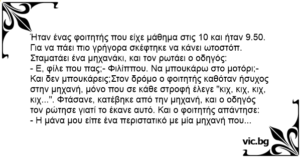 Ήταν ένας φοιτητής που είχε μάθημα στις 10 και ήταν 9.50. Για να πάει πιο γρήγορα σκέφτηκε να κάνει ωτοστόπ. Σταματάει ένα μηχανάκι, και τον ρωτάει ο οδηγός: