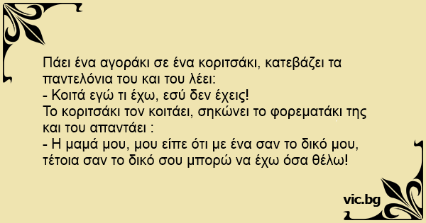 Πάει ένα αγοράκι σε ένα κοριτσάκι, κατεβάζει τα παντελόνια του και του λέει: