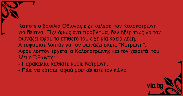 Κάποτε ο βασιλιά Όθωνας είχε καλέσει τον Κολοκοτρώνη για δείπνο. Είχε όμως ένα πρόβλημα, δεν ήξερ πώς να τον φωνάζει αφού το επίθετο του είχε μία κακιά λέξη. Αποφάσισε λοιπόν να τον φωνάζει σκέτο "Κοτρώνη".
