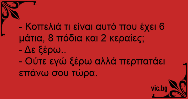 - Κοπελιά τι είναι αυτό που έχει 6 μάτια, 8 πόδια και 2 κεραίες;