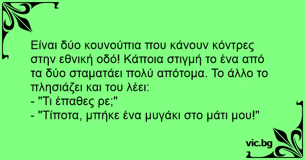 Είναι δύο κουνούπια που κάνουν κόντρες στην εθνική οδό! Κάποια στιγμή το ένα από τα δύο σταματάει πολύ απότομα. Το άλλο το πλησιάζει και του λέει: