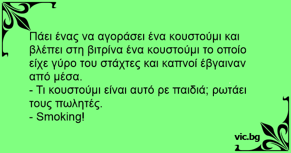 Πάει ένας να αγοράσει ένα κουστούμι και βλέπει στη βιτρίνα ένα κουστούμι το οποίο είχε γύρο του στάχτες και καπνοί έβγαιναν από μέσα.