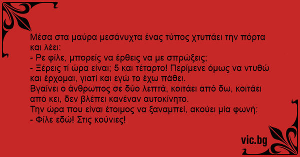 - Ξέρεις τί ώρα είναι; 5 και τέταρτο! Περίμενε όμως να ντυθώ και έρχομαι, γιατί και εγώ το έχω πάθει.