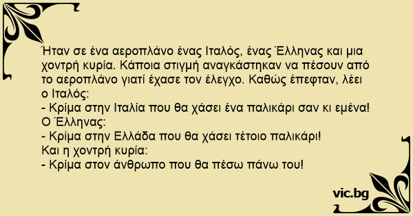 Ήταν σε ένα αεροπλάνο ένας Ιταλός, ένας Έλληνας και μια χοντρή κυρία. Κάποια στιγμή αναγκάστηκαν να πέσουν από το αεροπλάνο γιατί έχασε τον έλεγχο. Καθώς έπεφταν, λέει ο Ιταλός: