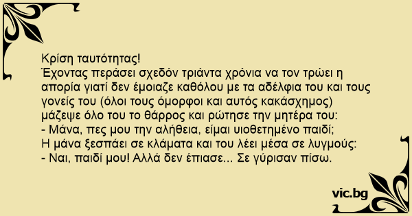 - Μάνα, πες μου την αλήθεια, είμαι υιοθετημένο παιδί;