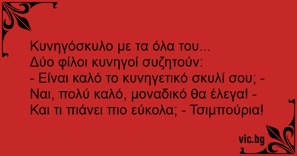 - Είναι καλό το κυνηγετικό σκυλί σου; - Ναι, πολύ καλό, μοναδικό θα έλεγα! - Και τι πιάνει πιο εύκολα; - Τσιμπούρια!