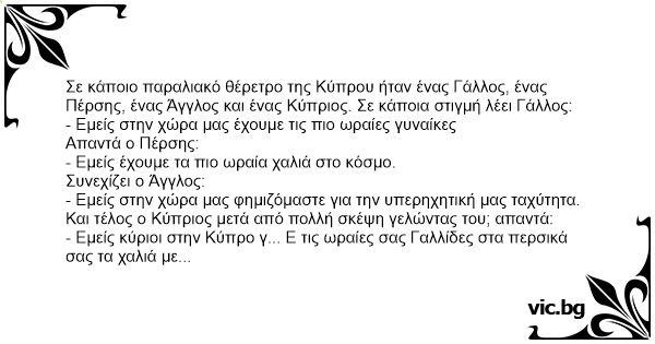 Σε κάποιο παραλιακό θέρετρο της Κύπρου ήταν ένας Γάλλος, ένας Πέρσης, ένας Άγγλος και ένας Κύπριος. Σε κάποια στιγμή λέει Γάλλος: