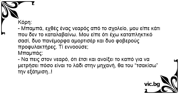 - Μπαμπά, εχθές ένας νεαρός από το σχολείο, μου είπε κάτι που δεν το καταλαβαίνω. Μου είπε ότι έχω καταπληκτικό σασί, δυο πανέμορφα αμορτισέρ και δυο φοβερούς προφυλακτήρες. Τί εννοούσε;