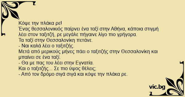 Ένας θεσσαλονικιός παίρνει ένα ταξί στην Αθήνα, κάποια στιγμή λέει στον ταξιτζή, ρε μεγάλε πήγαινε λίγο πιο γρήγορα.