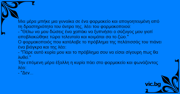 Μια μέρα μπήκε μια γυναίκα σε ένα φαρμακείο και απογοητευμένη από τη δραστηριότητα του άντρα της, λέει του φαρμακοποιού: