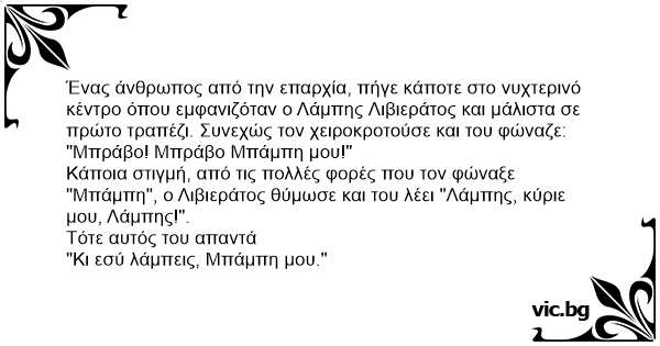 Ένας άνθρωπος από την επαρχία, πήγε κάποτε στο νυχτερινό κέντρο όπου εμφανιζόταν ο Λάμπης Λιβιεράτος και μάλιστα σε πρώτο τραπέζι. Συνεχώς τον χειροκροτούσε και του φώναζε:
