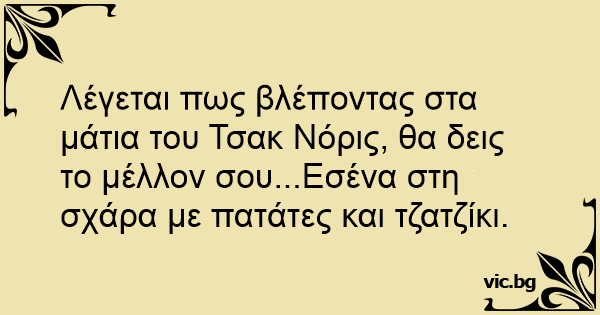 Λέγεται πως βλέποντας στα μάτια του Τσακ Νόρις, θα δεις το μέλλον σου...Εσένα στη σχάρα με πατάτες και τζατζίκι.