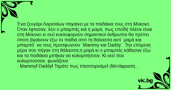 Ένα ζευγάρι Λαρισαίων πηγαίνει με τα παιδάκια τους στη Μύκονο. Όταν έφτασαν, λέει ο μπαμπάς και η μαμά, πως επειδή πλέον είναι στη Μύκονο κι εκεί κυκλοφορούν σημαντικοί άνθρωποι θα πρέπει όποτε βγαίνουν έξω τα παιδιά από τη θάλασσα αντί `μαμά και μπαμπά` να τους προσφωνούν `Mammy και Daddy`. Την επόμενη μέρα που πήγαν στη θάλασσα,η μαμά κι ο μπαμπάς κάθησαν έξω και τα παιδάκια μπήκαν να κολυμπήσουν. Κι εκεί που κολυμπούσαν, φωνάζουν: - Mammy! Daddy! Τηράτε πως πλατσαρνάμε! (Μετάφραση: Κοιτάξτε πως κολυμπάμε)